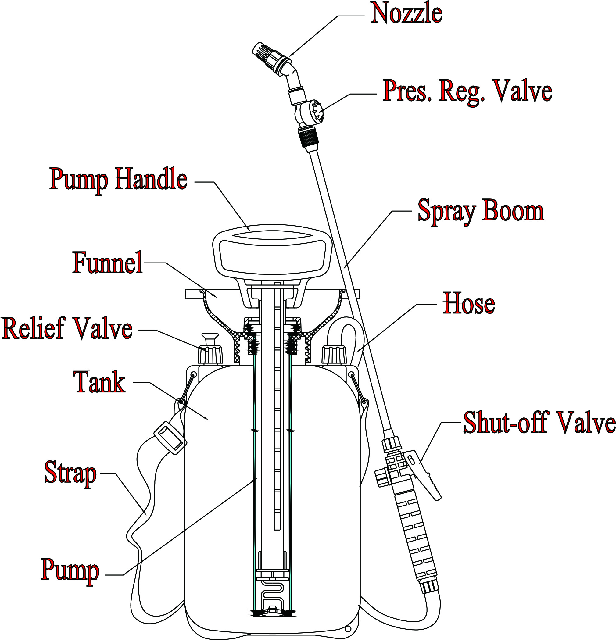 Compuesto por un tanque, una unidad de bomba (cilindro, manija, pistón, etc.), conjunto de pulverización (manguera, cierre, lanza y boquilla), válvula de alivio, correa, etc.